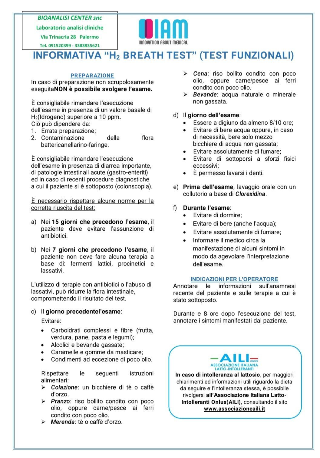 Qualora si sospetti un'intolleranza al lattosio, questa può essere facilmente smascherata dal cosiddetto test del respiro o breath test, disponibile presso il laboratorio diagnostico di Palermo. Tramite questo esame si valuta la concentrazione di idrogeno nell'aria espirata dopo un carico di lattosio. Dal momento che la fermentazione dello zucchero indigerito produce idrogeno che viene prontamente riassorbito dalle pareti intestinali ed eliminato con la respirazione, in caso di intolleranza al lattosio si osserva un picco di concentrazione di idrogeno nell'aria espirata.