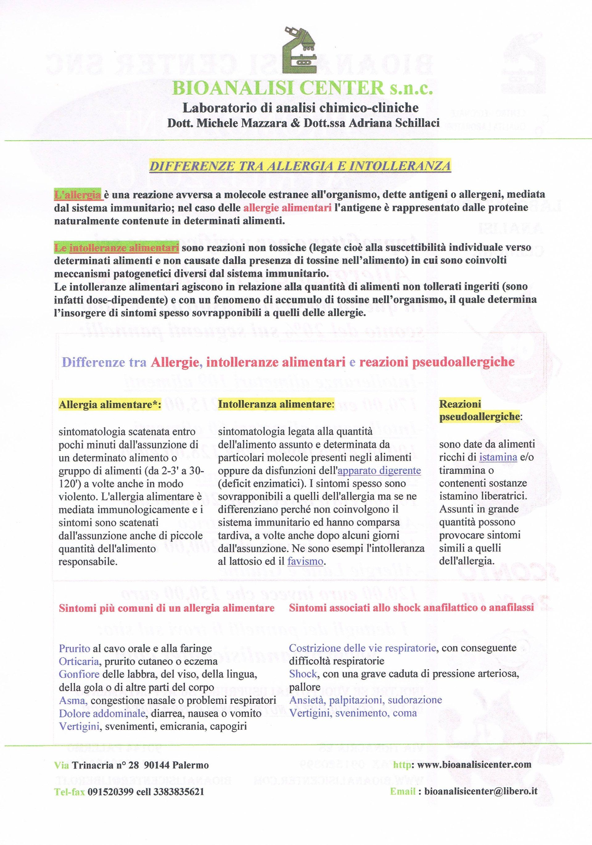 Bioanalisi Center a Palermo è all'avanguardia per metodi di diagnosi delle intolleranze alimentari. Le intolleranze alimentari sono reazioni non tossiche (legate cioè alla suscettibilità individuale verso determinati alimenti e non causate dalla presenza di tossine nell'alimento) in cui sono coinvolti meccanismi patogenetici diversi dal sistema immunitario. Le intolleranze alimentari agiscono in relazione alla quantità di alimenti non tollerati ingeriti (sono infatti dose-dipendente) e con un fenomeno di accumulo di tossine nell'organismo, il quale determina l’insorgere di sintomi spesso sovrapponibili a quelli delle allergie.